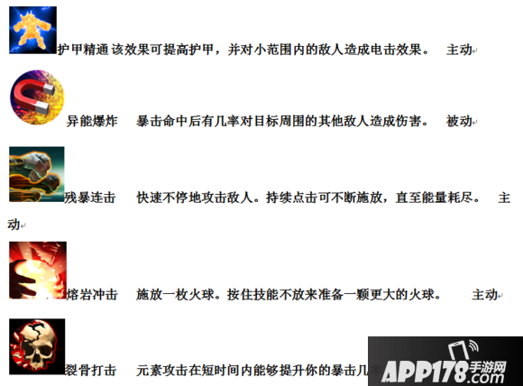 该英雄在中后期同样也有两条转职路线可供选择,一个是重拳大师埃洛克。埃洛克虽然是元素格斗师,但即使在不借助元素之力的情况下,相信我,他的拳头依旧可以打掉敌人的门牙。埃洛克既有可以造成土系伤害并摧毁敌人的护甲的碎石击,也有可以将敌人拉至身边并造成持续的燃烧效果的烈焰锚钩,还有可以冻结大地干扰敌人行动的极寒冰霜,体现了元素与力量的完美结合。他既可以以一下下的重拳粉碎敌人的护甲,也可以利用自己快如闪电拳头发动袭击给敌人造成成吨伤害。以下是技能说明: