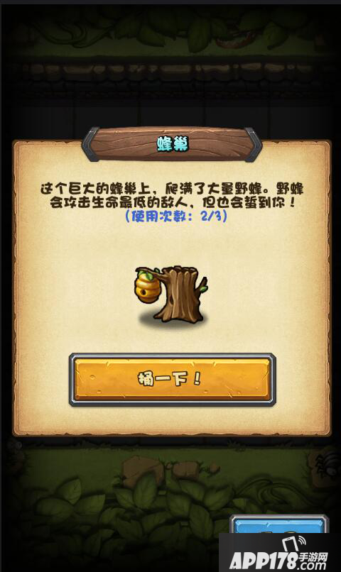 蜂巢:触发蜂巢,野蜂会攻击场上生命值最低的敌人,但同时也会攻击出战的冈布奥。这是一个出色的道具,可以对敌人造成大量的伤害,而自己所受到的伤害却只有1点!在消灭一些攻击较高但生命较低或者附带中毒效果的蜘蛛时尤为好用,不过一个蜂巢仅能使用三次,各位玩家需要好好的考虑。