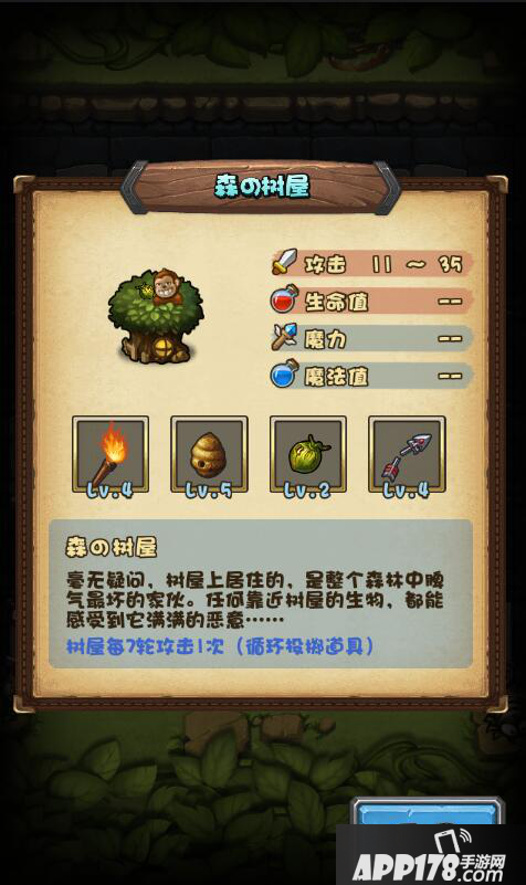 森の树屋:这是一个近期版本中新增添的场景道具,玩家需要通过搜集不同的物品来激活这一道具,分别是火把、蜂巢、烂掉的野果和断掉的弩箭,并且通过不断的提交所收集到的这些物品还能对其效果进行升级!树屋每七轮会发动一次攻击,攻击为循环投掷以上搜集到的道具,每一个道具都有着不同的攻击特效,好好利用就能达到极佳的效果!
