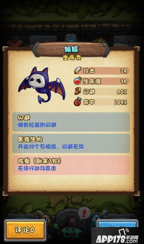 蝙蝠:拥有较高的闪避值,翻开20个石板之后闪避失效。老实说蝙蝠确实是一个令人头疼的敌人,用普通攻击的话很容易被其闪避无法造成伤害,对于物理攻击的冈布奥很是堪忧,虽然地图场景提供了蜂巢这个道具来帮助玩家对蝙蝠造成伤害,不过到了后期蝙蝠的生命值有了较大幅度的提升,仅有一个蜂巢很难清理场上所有的蝙蝠,所以这里还是推荐大家使用魔法攻击的冈布奥进行战斗。