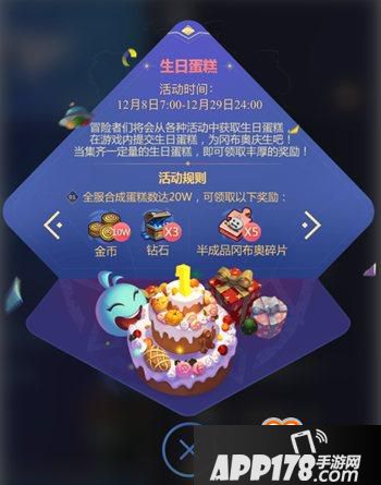 蛋糕数量达20W:金币*10W、钻石*3、半成品冈布奥碎片*5
