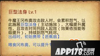 巨型法身:牛魔王冈布奥攻击敌人时,会积累怒气,以此施展巨型法身(主动释放),大幅提升属性,且攻击对同列敌人起效(效果依技能等级提升),持续到怒气耗尽。