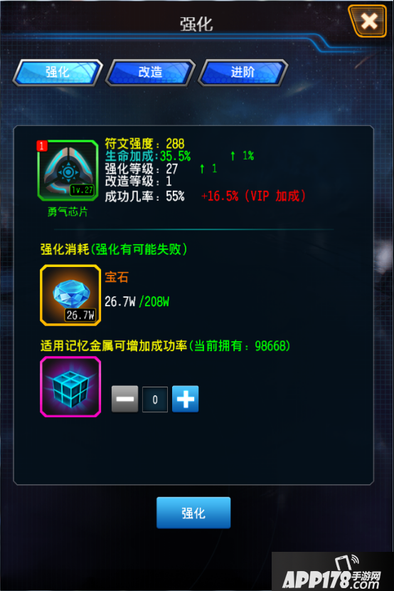 强化存在成功率(提升VIP和使用道具可提升成功率)。