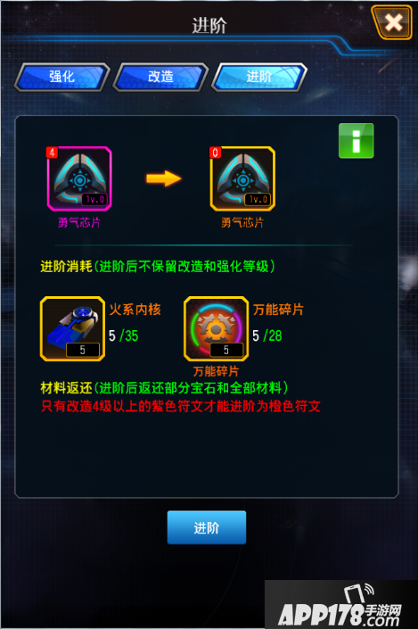 进阶条件为:紫色符文且改造等级4以上;