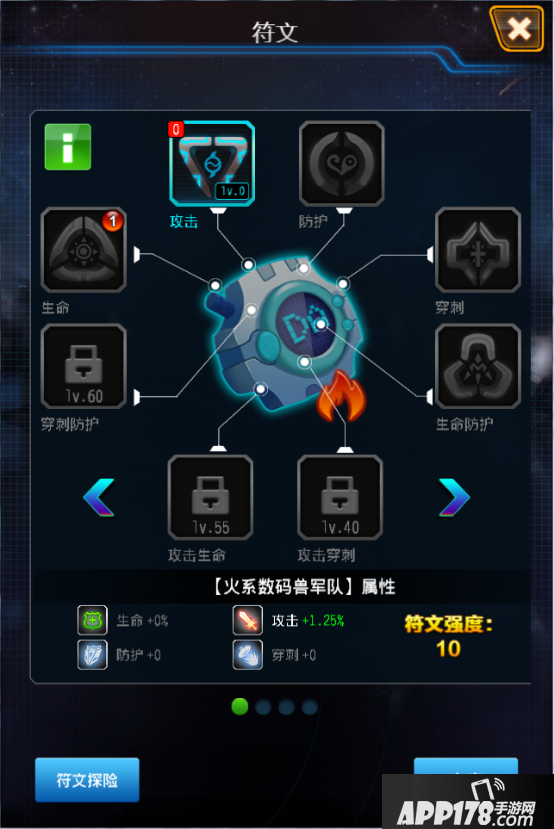 符文的加成对象为4类数码兽兵种,而不是数码兽个体。即4个页面,如主界面居中的暴龙机代表含义。