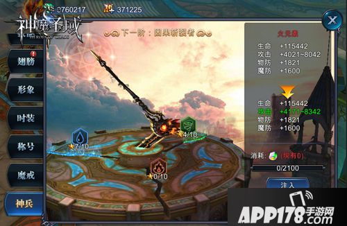 装备神兵后可进行培养,神兵有三个元素之力,每个元素之力都可以独立注入升星,需要消耗大量的元素石来提升星级,元素石可以在荣誉商店通过荣誉兑换获得,神兵的觉醒升阶受到元素之力星级的限制,且在全部元素石注满后,消耗对应品阶所需的装备道具,才能觉醒。目前神兵晋升到5阶之后各项属性值都达到最大化。获得神兵后不仅拥有的华丽的外形,释放连击的动作也更加炫酷,并且会有耀眼的特效释放出来,让你在战斗时秒杀一切对手。