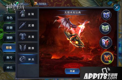 装备神兵后,角色界面对应显示神兵装备图标,装备第一阶的神兵后,可以激活神兵界面, 在人物界面也会出现神兵菜单。获得神兵后还可以进行培养,培养可以提升神兵的等级,获得更多的属性加成,神兵也有多种外形供选择,当然越是霸气的神兵,属性值也越高。