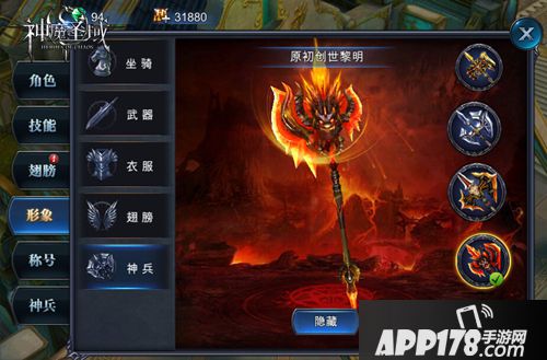 战士的神兵以神斧为原型设计的,品阶从低到高依次是“天煞”、“裁决斧”、“神罚一击”、“大地撕裂者”、“原初创世黎明”。