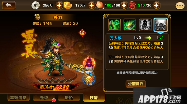 二爷技能带破甲、无视防御、斩杀,果然符合二爷暴力输出的特性,情缘和天赋加血量、攻击、防御。二爷就是个攻防俱佳的多面手。