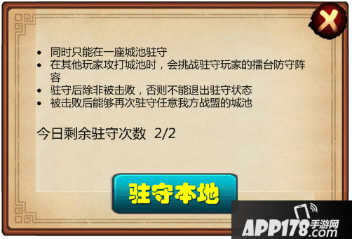 点击守城则会提示守城规则,确认则玩家驻守到该城内。假如当前玩家已经驻守在了其他城,会弹出提示“你当前正在驻守【城市名】”