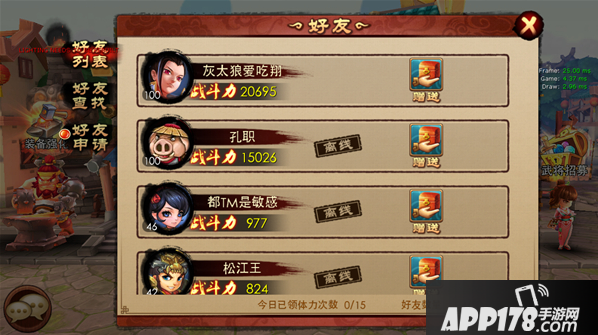 玩家通过好友列表对好友发起私聊或者赠送体力,领取别人送自己的体力。