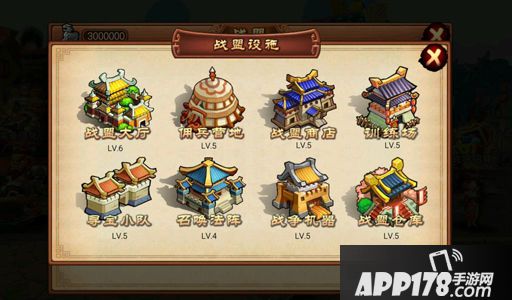 战盟设施包括:战盟大厅,佣兵营地,战盟商店,训练场,寻宝小队,召唤法阵,战争机械,战争仓库。