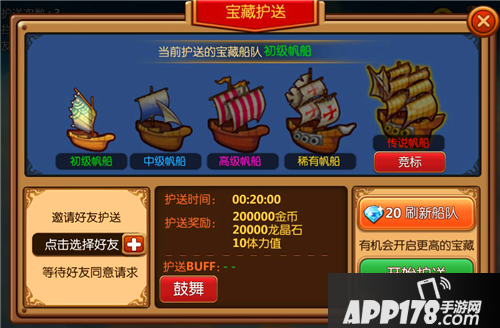 4.宝藏存放的帆船有5种,其中越高级的帆船护送奖励越丰厚,但所需护送的时间也越长,传说帆船需要竞标召唤,竞标需要花费200钻石;如果不满足初始的帆船,可以使用20钻石进行刷新,有机会刷到更高级的帆船。