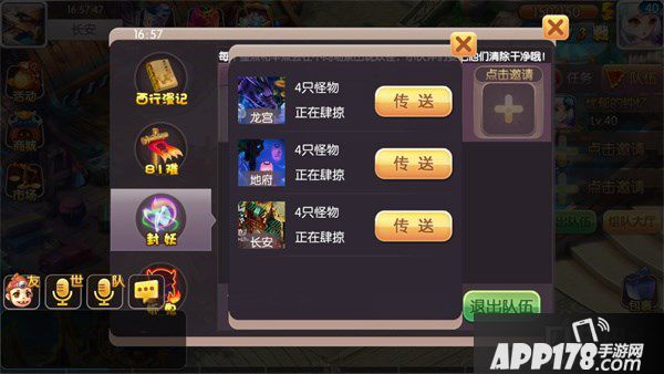 组队之后,队长可以在龙宫、长安城、地府寻找魔族踪迹,点击怪物进行挑战。挑战成功即可获得丰厚的奖励。