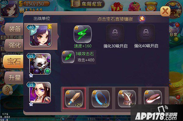 30级开启宝石镶嵌,每件装备上可以镶嵌3个不同种类宝石!全身装备40颗宝石还可以触发对应的宝石加成属性哦!宝石主要在商城、封妖中获得!