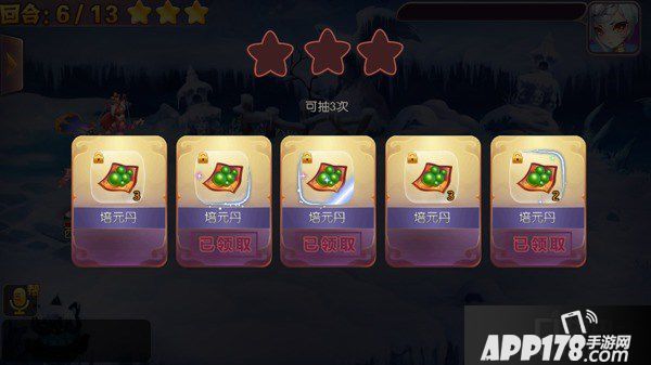 翻牌子奖励:翻牌子可以随机获得不同数量的神将进阶材料和铜钱奖励,每个关卡最多可以翻3个牌子,翻牌子的次数由通关星数确定,三星通关可以获得三次翻牌子的机会,能获得更多的材料!通关星数根据战斗回合数而定,分为一星通关、二星通关和三星通关,回合数越短,星数越多。