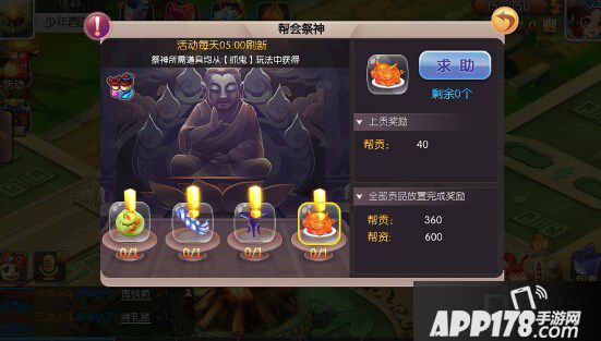 当自己的祭神道具不足时也不用担心哦,可以向同帮会的玩家求助,同样的如果自己的道具有多的时候也可以帮助其他玩家上贡,单个贡品的收益会给到帮助者。