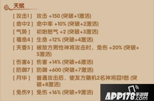 5.天香5:被敌方男性神将攻击时,免伤+20%(突破+5激活)