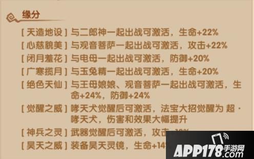 心慈貌美:与观音菩萨一起出战可激活,攻击+22%