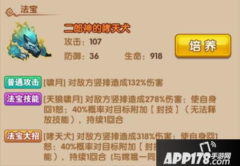 法宝大招:【哮天犬】对敌方竖排造成318%伤害;使自身回1怒;40%概率对目标附加【封技】(无法释放技能),持续1回合(与嫦娥一同出战可触发)