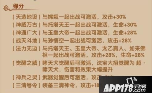 法力无边:与托塔天王、玉皇大帝、太乙真人、如来佛祖一起出战可激活,攻击+28%、生命+28%