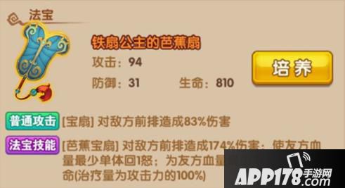 法宝技能:【芭蕉宝扇】对敌方前排造成174%伤害;使友方血量最少单体回1怒;为友方血量最少单体回复生命(治疗量为攻击力的100%)