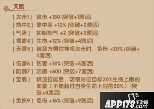 8.宝扇:施放技能后,吸取对位目标20%生命上限的血量(不能超过自身生命上限的50%)(突破+8激活)