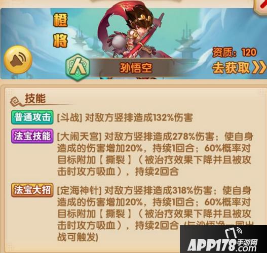 法宝技能:【大闹天宫】对敌方竖排造成278%伤害;使自身造成的伤害增加20%,持续1回合;60%概率对目标附加【撕裂】(被治疗效果下降并且被攻击时攻方吸血),持续2回合