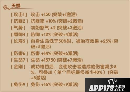8.金刚:成功格挡后,会使攻击者造成的伤害减少8%,可叠加(单个目标最多减少40%)(突破+8激活)