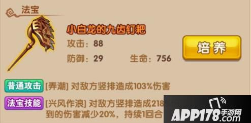法宝技能:【兴风作浪】对敌方竖排造成218%伤害;使自身受到的伤害减少20%,持续1回合