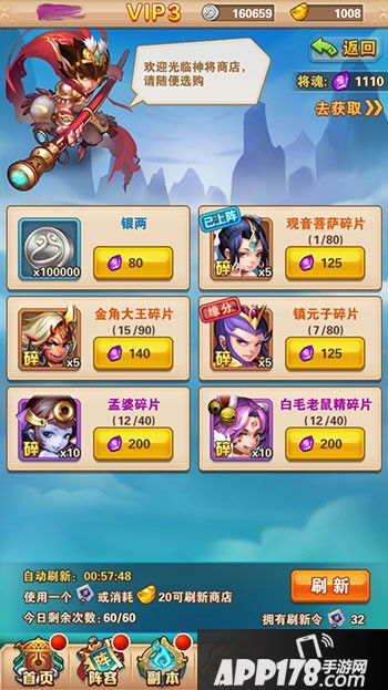 2.神将商店:游戏中可是非常容易刷出整个橙将的,可以直接用将魂、元宝购买。