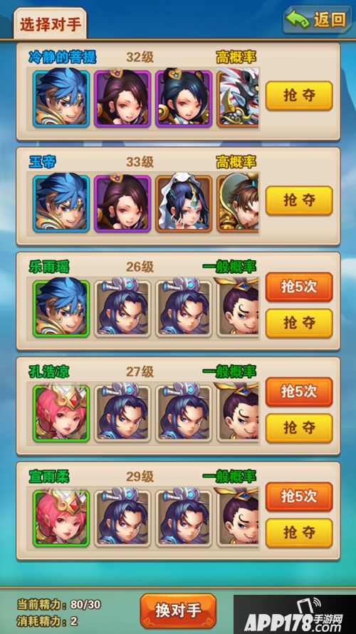 2、夺宝时会有被夺玩家列表,并显示抢夺各个玩家的成功率,该概率分为较高、高、一般、较低、低,但是宝物碎片品质越高,成功率则越低。小编推荐大家选择概率高,且等级不能比自己高太多的号抢夺,这样,既保证能够打败对手不浪费精力,又能保证抢夺到宝物。