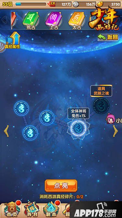 西游真经可提升主角品质,获全阵容属性加成,更有稀有资源如武器之魂,橙将碎片产出,需消耗西游真经碎片。
