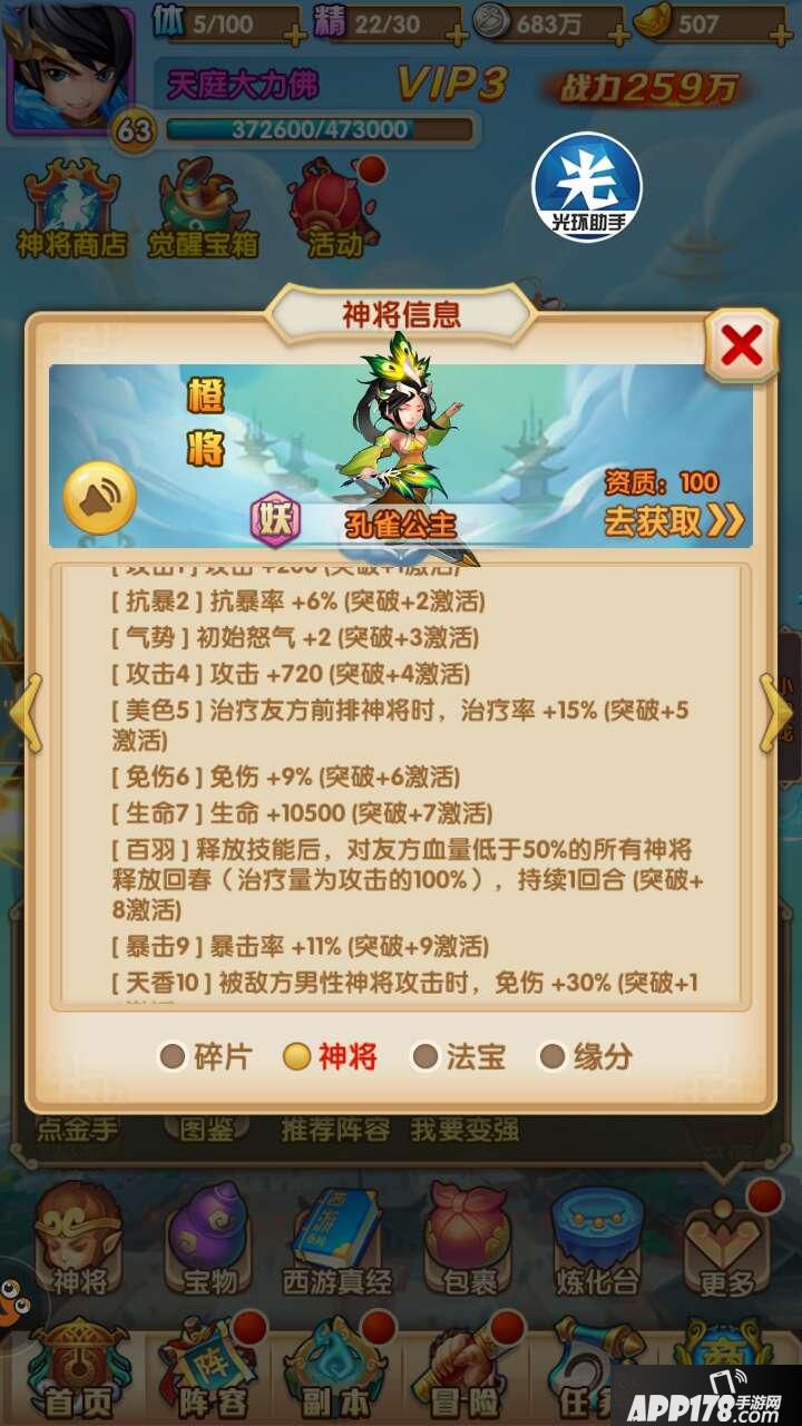技能分析:孔雀公主在治疗的同时增加友方前排的格挡,法宝觉醒后格挡范围至群体,大大增加了友方的存活。