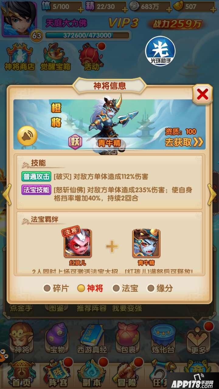 技能分析:青牛精对单体造成伤害同时增加自身格挡,是个超级肉盾,法宝觉醒增加格挡效果触发几率和格挡回合。