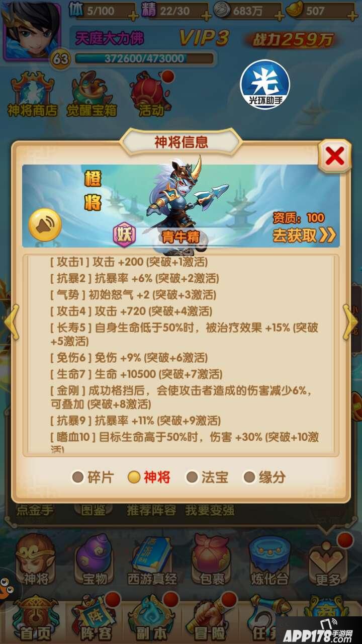 突破分析:突五增加青牛的低血存活,配合妖族的神回血很好用,突八起到了压制对手输出的效果,突十的青牛增加了对血量多对手的伤害较为无力。