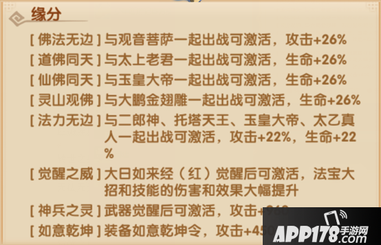 佛法无边:与观音菩萨一起出战可激活,攻击+26%