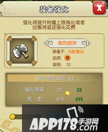 给装备升级,提高装备的属性.强化等级越高,消耗的石币数越多,可自动强化至最高级.强化将提升附魔上限。炼化或者出售将返还强化花费。