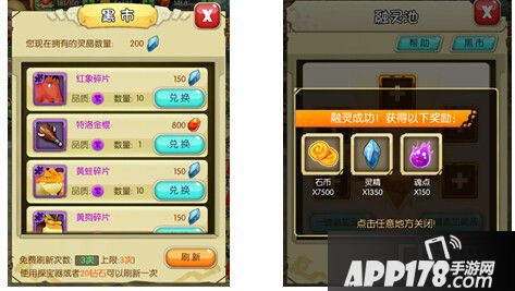 黑市每2小时可免费刷新一次商品列表,每日免费刷新次数上限为8次。玩家也可使用道具“探宝器”或消耗钻石进行随时刷新。在黑市兑换宝物根据交易要求,大部分宝物是需要使用灵晶兑换的,而小部分则需要使用钻石进行兑换。灵晶可以通过在融灵池中融解紫色及以上品质宠物获得。