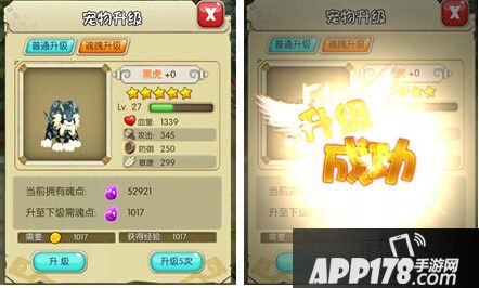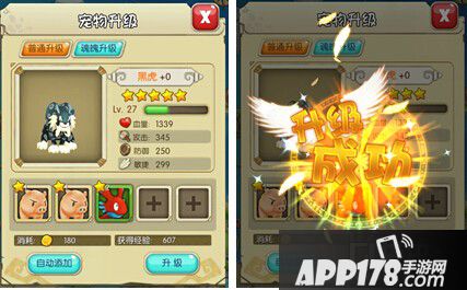 目前游戏中支持的宠物升级方法共有两种:普通升级、魂魄升级。普通升级是使用陪练材料宠物对主升级宠物进行等级提升的方法,需要消耗金钱石币、陪练宠物进行升级。陪练宠物的等级越高,可获取的经验也就越多。玩家可手动添加想要作为升级材料的宠物,也可使用自动添加功能,系统会自动选择低品质宠物进行添加。在确认无误后,点击“升级”键,即可完成主宠物升级操作了。
