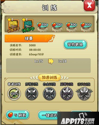 训练功能解锁时只有一个训练槽位,玩家可使用龙蛋购买新的训练槽位,这样就可以同时对多只宠物进行训练了。宠物每次训练需要8小时,训练获得经验根据不同类型训练模式而不同,玩家可消耗龙蛋进行训练模式刷新,从而获得高效训练提升经验收益。如果觉得每次手刷太慢的话,也可以使用“一键逆天”功能,自动消耗龙蛋刷新训练模式,直到玩家满意时点击停止即可结束自动刷新。当确认无误后,点击开始训练,您的爱宠即可开始快速收获经验提升等级的训练喽~