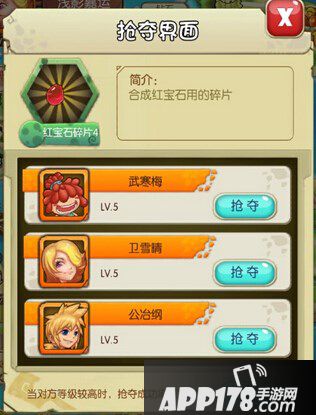在抢夺活动界面中,玩家点击想要抢夺的空白宝石碎片位,即可进入抢夺界面。该界面中列表为备选抢夺玩家,玩家可进行刷新更换备抢夺目标,抢夺目标玩家等级越高,抢夺胜利后获得宝石碎片的成功率越高。抢夺战胜利后,无论是否成功抢到宝石碎片,都会获得一次3选1宝箱的机会,可随机开出各种道具、石币。