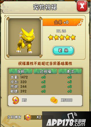 玩家在“祝福”界面通过对宠物进行祝福,可随机增加一定量的宠物属性。进行祝福需要消耗一定数量的金钱石币和道具“祝福石”,祝福石可由通过在副本活动、声望商城、黑市、宝箱等途径进行获取。