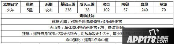 火年是只后排输出型宠物,全体伤害技能令人畏惧,单体伤害技能强悍输出。是个持久输出型的宠物。