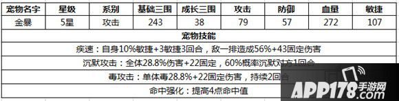 金暴是一只攻击型的宠物,自身敏捷不俗,还有疾速技能增加敏捷。AOE输出。并附有沉默功能。毒攻击可以对对方单体造成中毒伤害。是个应用性很不错的宠物。