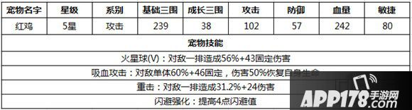 红鸡以其呆萌的样貌博得很多玩家的青睐。红鸡技能也有不俗的表现,两个攻击一排的技能,有不错的输出。红鸡定位是攻击型的宠物。