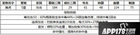 推荐理由:毒宠,根据自身攻击增强中毒效果,小编不推荐此宠,主要是主动技能需要消耗4个技能点,不划算。除非你把老虎的攻击培养的很高,这样可以持续1回合的高伤害,而且还需要给力的肉盾辅助。
