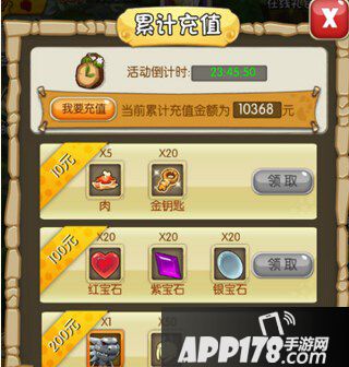 累计充值100元可获得 1级红宝石*20 1级紫宝石*20 1级银宝石*20