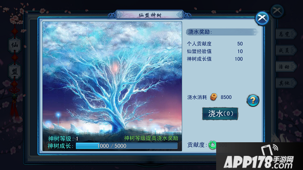 仙盟神树:仙盟成员每天可以给神树进行浇水,神树经验值满后会自动升级。