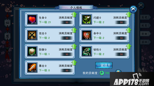 个人修炼:通过修炼提高人物自身属性,修炼等级不可以超过角色等级,修炼需消耗个人贡献度。